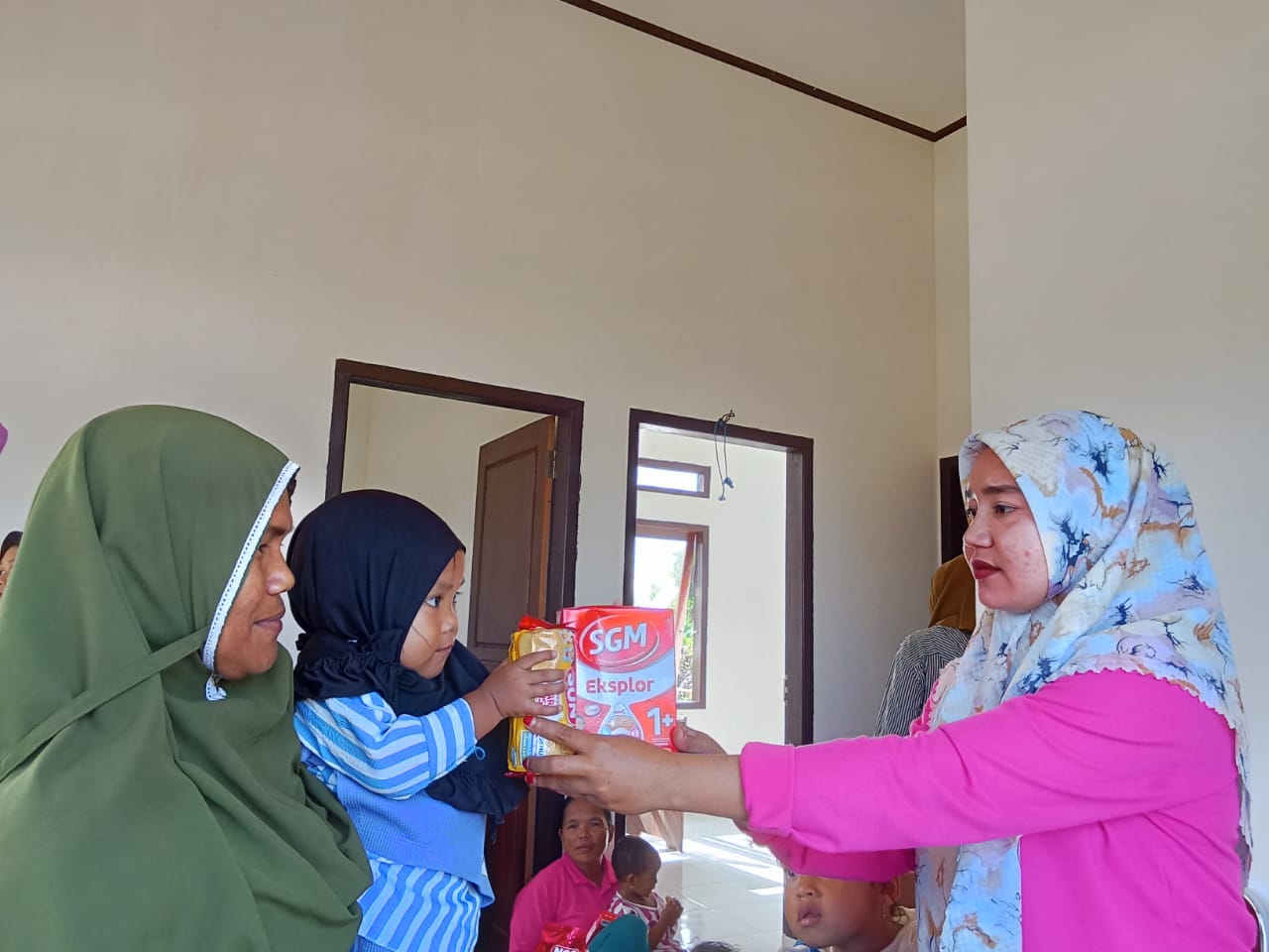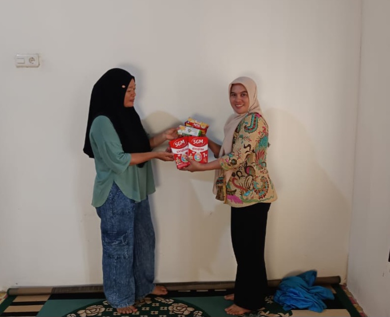 Penjabat Kepala Desa Baho Puuwulu, Mirna SKM saat menyerahkan bantuan PMT kepada Perwakilan Kader Posyandu Desa Baho Puuwulu.