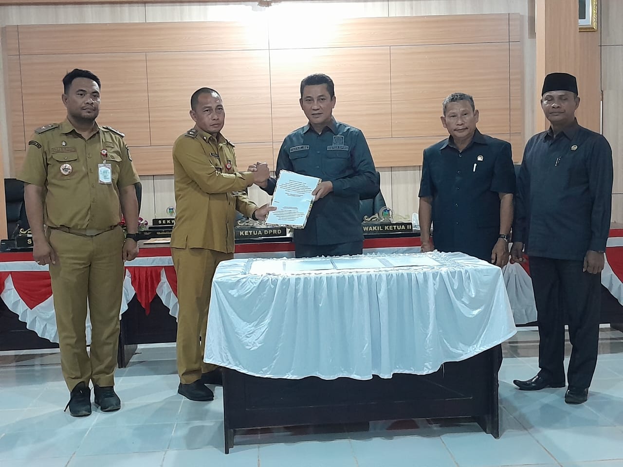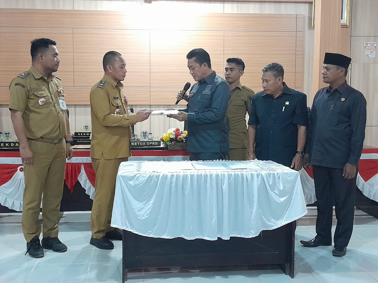 Penyerahan Draft Raperda atas Perubahan Perda nomor 1 tahun 2019 tentang BPD di Ruang Paripurna DPRD Konkep oleh Plt Sekda Konkep, Mahmud SP MPW kepada Ketua DPRD Konkep, Ishak SE.