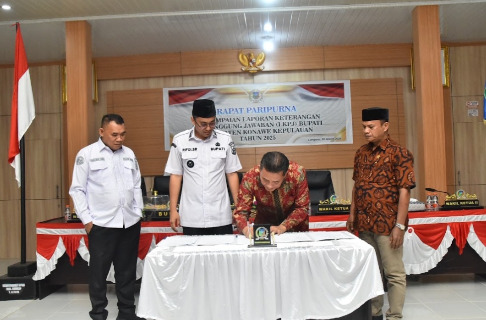 Bupati Konkep bersama Ketua DPRD Konkep saat menandatangani persetujuan LKPJ Tahun Anggaran 2025 di Ruang Paripurna DPRD Konkep, Rabu (8/4/2026).